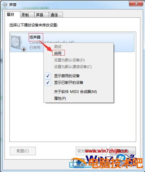 6、然后右击【播放】下的【扬声器】,选择【启用】。