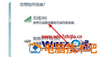5、在选择连接方式这个页面中,如果你有无线网络,就会在下面的列表中显示出一个无线连接的选项。用鼠标点击一下这个选项,然后点击确定。