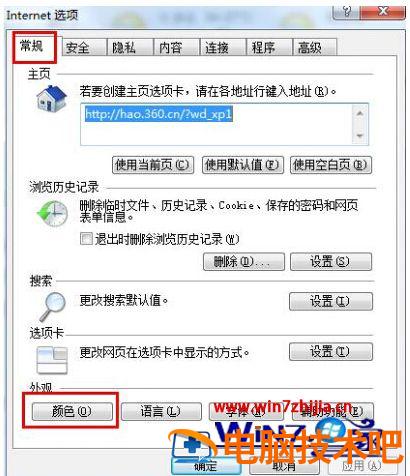 2、在打开的“Internet选项(O)”中,切换到“常规”项,点击“颜色(O)”进入下一步操作。