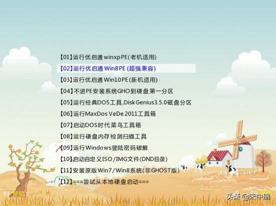 第一步:将制作好的优启通U盘插入电脑usb接口,重启电脑,当出现开机画面时连续按快捷键进入优启通主菜单界面;如图,选择【02】运行优启通Win8PE(超强兼容),按回车键确认: