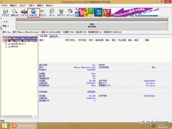 打开后,选好要分区的硬盘,然后在工具栏点击 “快速分区”: