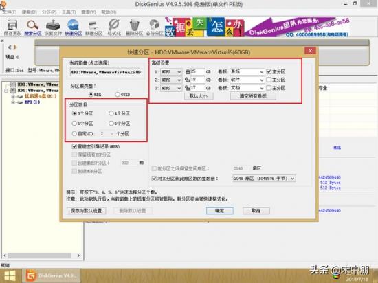 第三步:随后会弹出一个窗口,可以选择分区数目,设置磁盘格式、大小、卷标等,设置好后点击“确定”: