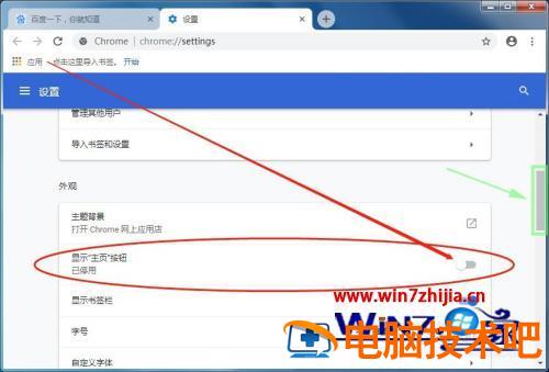 4、(移动浏览器右侧的下拉滚动条),找到外观中的“显示‘主页’按钮”,点击一下。