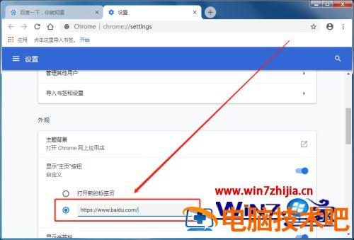 5、点击一下输入自定义网址前的空心小圆圈,并在文本框里输入想要设置的主页的网址。