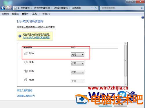 4、进入系统图标页面后,我们看到时钟选项是关闭状态,我们将其设置成打开。这时我们看一下右下角系统时间已经显示出来了。