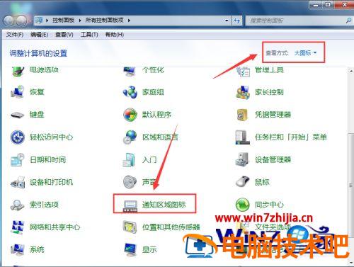 2、进入控制面板页面后将查看方式设置成查看大图标,并在页面下方找到“通知区域图标”然后打开。