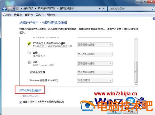 3、进入通知区域图标页面后,在页面的下方找到“打开或关闭系统图标”并点击。