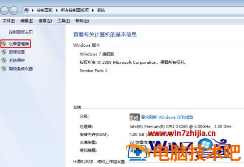 2、打开的系统属性界面如下图所示,在该界面左边找到设备管理器标签,这里列出了设备管理、远程设置、系统保护、高级系统设置等四个标签,鼠标左键点击相应的标签即可进行相关界面。