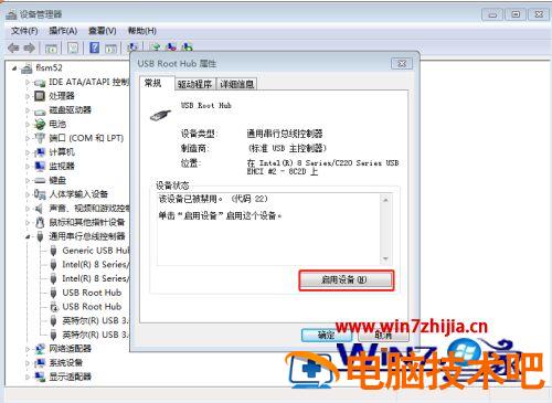 5、这时候,我们点开其中的任何一个,就会发现这个设备状态都是禁用的,就是因为这个导致USB接口不能使用,鼠标左键点击启用设备字样进行USB接口启用。