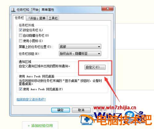 2、进入任务栏和【开始】菜单属性界面,点击自定义;