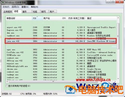 4、打开【Windows 任务管理器】窗口,找到对应PID的进程,可以看到该端口被java.exe进程占用。