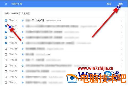 5、这时我们就可以点击左边的选项框来选中我们所需要删除的浏览记录,点击勾选后我们点击右上角的“删除”键来删除。如下图所示;