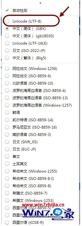 4、这时会弹出一个网页编码的菜单。里面含有多种网页语言编码。我们点击选择Unicode(UTF-8)。