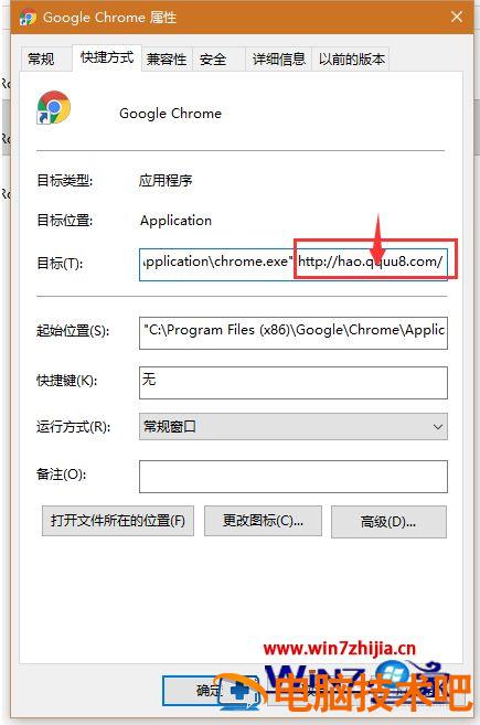 4、在“快捷方式”选项卡下的目标栏中,将【…chrome.exe”】后面的网址删掉,然后点击应用。