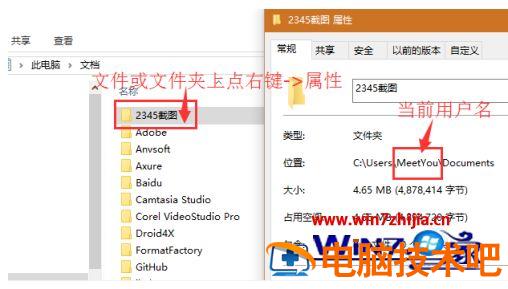 (3)在任意一个文件或文件上点右键,然后点属性,在弹出属性窗口中的位置栏中可以看到用户名。