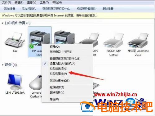 2、单击选中自己的打印机,右键点击“打印机属性”;
