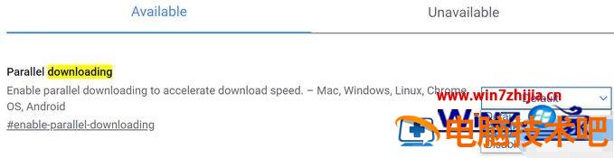 2、在搜索栏中搜索“downloading”,可以看到一个“Parallet download”的选项,这是多线程下载的意思。这个选项默认是处于“Default”档位关闭的,将它改成“enable”,就可以开启Chrome的多线程下载支持了。
