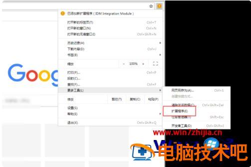 4、在更多工具扩展栏里,点击选择“扩展程序”;