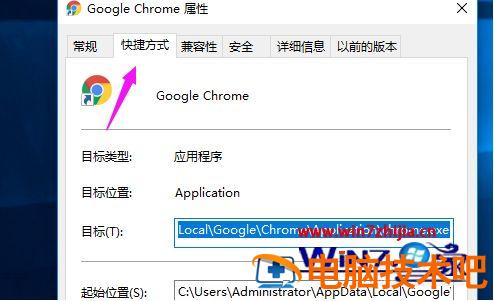 1、点下Chrome浏览器快捷方式,接着点下【属性】,属性里点【快捷方式】,如图。