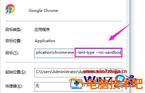2、接着在目标中加入【 –test-type –no-sandbox】,点确定,如图。