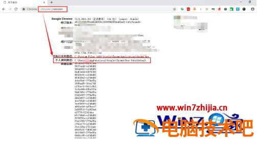 2、打开chrome浏览器,在浏览器的URL中输入网址//version按下回车键,chrome浏览器中会显示个人资料路径,复制该路径。