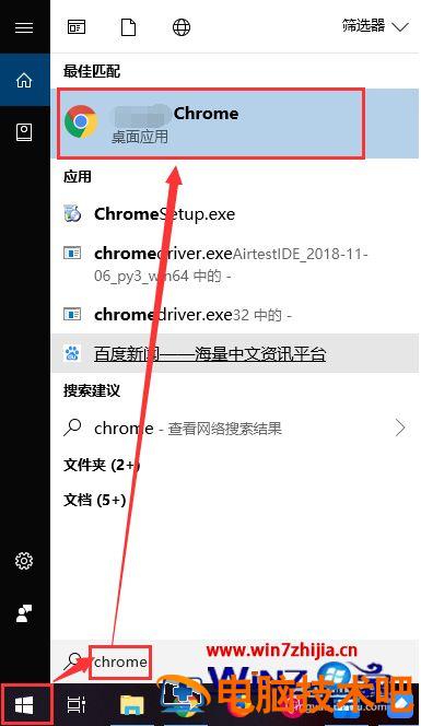 1、点击win10系统的开始菜单,直接键盘输入chrome,点击查询出来的Chrome应用。