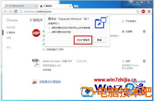 6、拖过来后,会弹出一个小窗口,询问“要添加SeparateWindows吗”,点击“添加扩展程序”按钮。