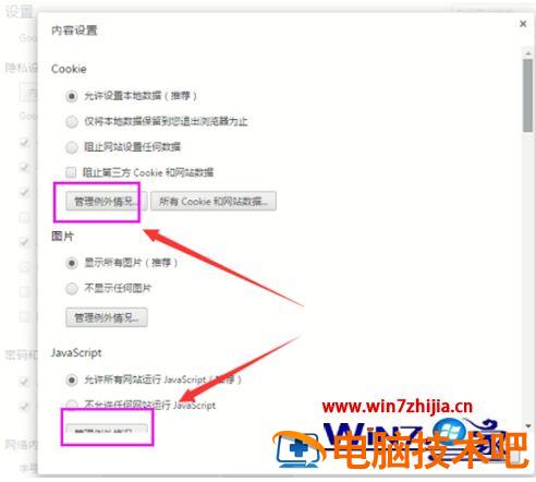 4、谷歌浏览器添加信任排除列外网站,点击管理列外情况,cookies 和脚本。