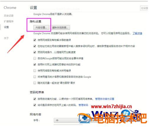 在chrome高级选项设置里面,找到【隐私设置】如图,内容设置里面,也就是信任网站添加的位置啦。