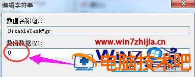 6、双击打开刚刚创建的【DisableTaskMgr】,在【数值】一项,设置成【0】,然后点击【确定】,即可解决问题。