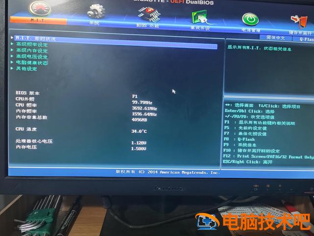 然后进入BIOS界面,我们需要了解以下重要的操作方法:通过键盘上的方向键移动光标;返回键表示确定;F表示保存并退出。具体以BIOS以界面说明为准。如图所示: