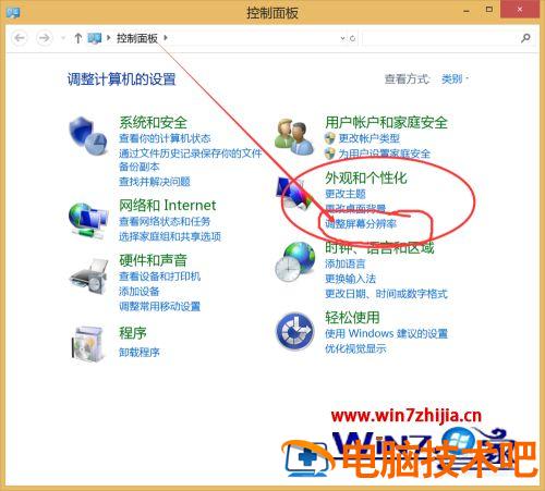 5、有的时候也会因为是笔记本屏幕分辨率太低了导致的,这个时候我们还是点击控制面板进入在点击外观和个性找到调整屏幕的分辨率;