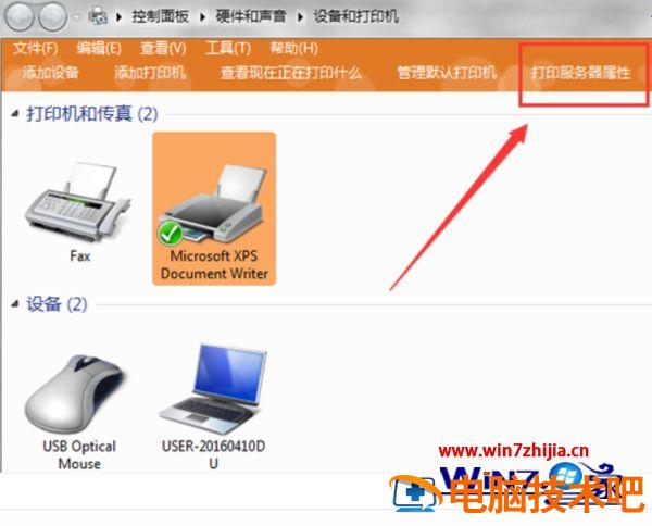 8、又回到打印机页面,在右上角找到“打印服务器属性”。