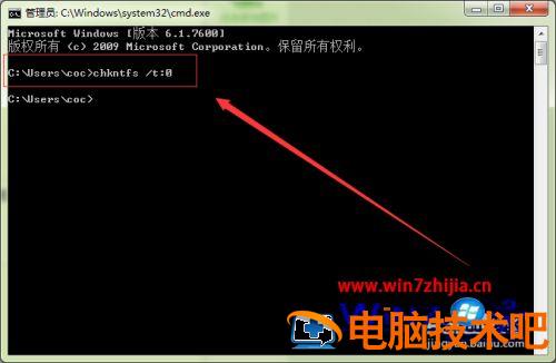 2、取消磁盘自检的命令是CHKNTFS/T:0 ,将这个命令输入,按确定回车,CHKNTFS后面的参数T为时间,0为零秒,检查时间为0秒,也就是不用检查了,取消自检的意思。