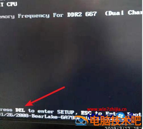 3、在重启时,等到显示器出现黑背景,白字的时候,就会看到进入bios的方法了,这里提示要按着del键。