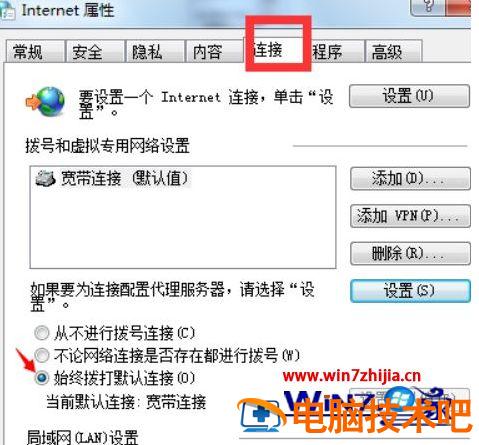 6、回到internet属性之后,选择“始终拨打默认连接”,即可。