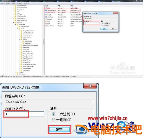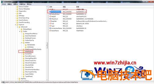 3、依次找到HKEY_LOCAL_MACHINE\Software\Microsoft\Windows\CurrentVersion\explorer\Advanced\Folder\Hidden【SHOWALL】的【CheckedValue】的值修改为1。