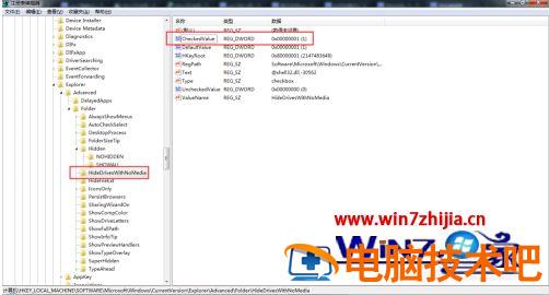 4、把HKEY_LOCAL_MACHINE\Software\Microsoft\Windows\CurrentVersion\explorer\Advanced\Folder【HideDrivesWithNoMedia】的【CheckedValue】的值修改为1。