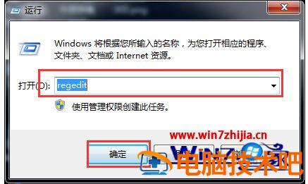 2、在弹出的对话框里键入“regedit”点击“确定”打开注册表。(或者直接按键盘上的win键和R键)。