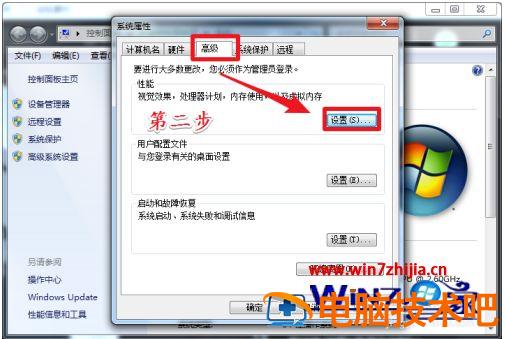 2、打开“高级系统设置”选项以后。依次点击“高级”->“设置”。