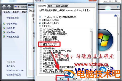 3、进入设置界面以后。将下方选项列表中的“启用Aero Peek”勾选中。最后点击确定即可。
