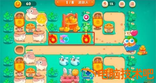 3.第三步在下排设置新炮塔,兔子快清完时让炮塔清理其他道具。