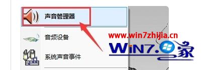 4、将耳机插入电脑后置耳机插孔,再选择电脑右下角的小喇叭,右击,选择“声音管理器”。