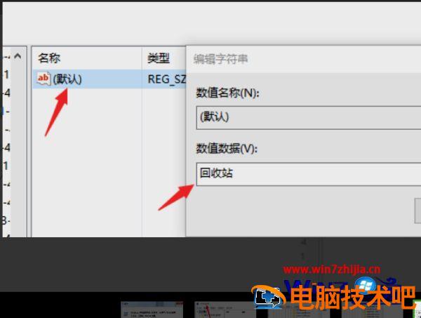 5、然后选中其右边窗口中的“默认”选项,点击鼠标右键,在右键菜单中选择“修改”进行点击,然后输入“回收站”,点击确认。最后退出“注册表编辑器”后重启电脑,删掉的软件即可恢复。