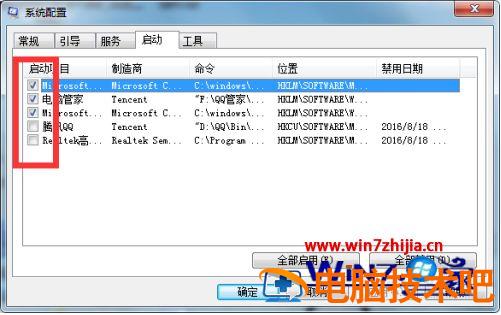 4、当我们点击了–启动–页签了以后,然后我们进入到了电脑开机启动项目的管理页面,然后我们只要将我们不需要开机启动的程序进行取消勾选即可,如果都不需要就直接点击右下方的–全部禁用–,如下图所示。