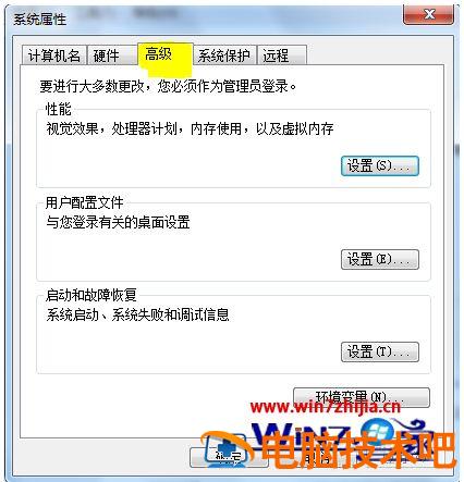 3、会出现这样的窗口,选择高级选项卡,点击性能中的设置。