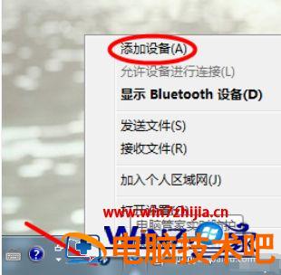 2、右键点击蓝牙,点击添加设备。