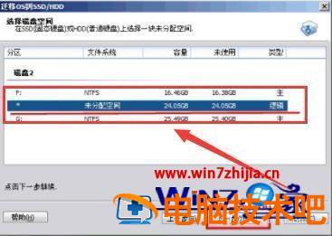 5、选中硬盘上的“未分配空间”(固态硬盘中的空分区位置),点击“下一步”继续。大家可以修改相关信息(包括大小,位置,和盘符),通常都保持默认设置。