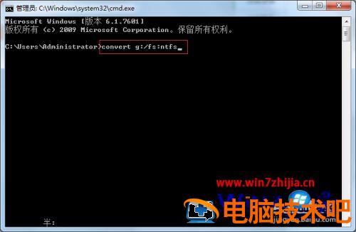 4、在弹出的对话框中,输入’convert g:/fs:ntfs’并回车确定。(这边g:/代表U盘所在盘符,根据电脑中U盘实际显示盘符正确输入盘符)