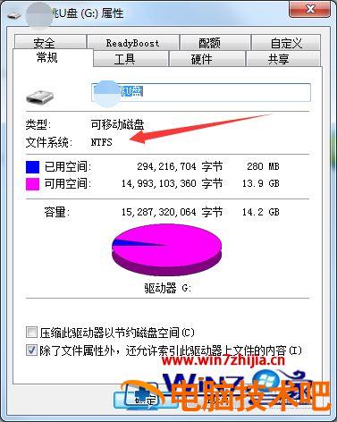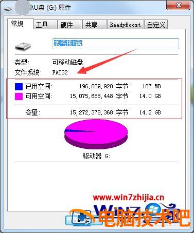 2、在打开的属性窗口中,可以看到笔者的U盘还有14G的空间,但是文件系统是FAT32,所以当单个文件大于4g的时候将会提示文件过大无法复制到U盘。